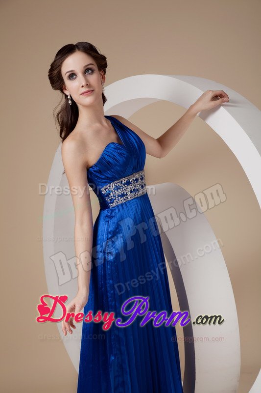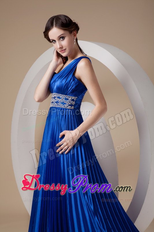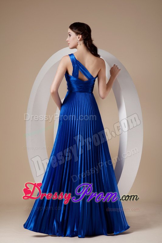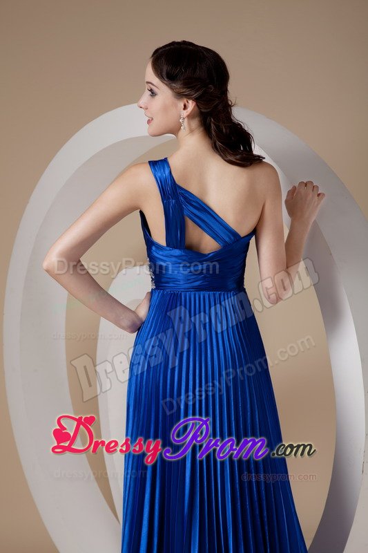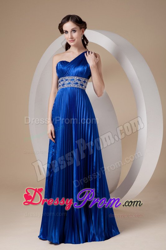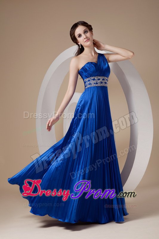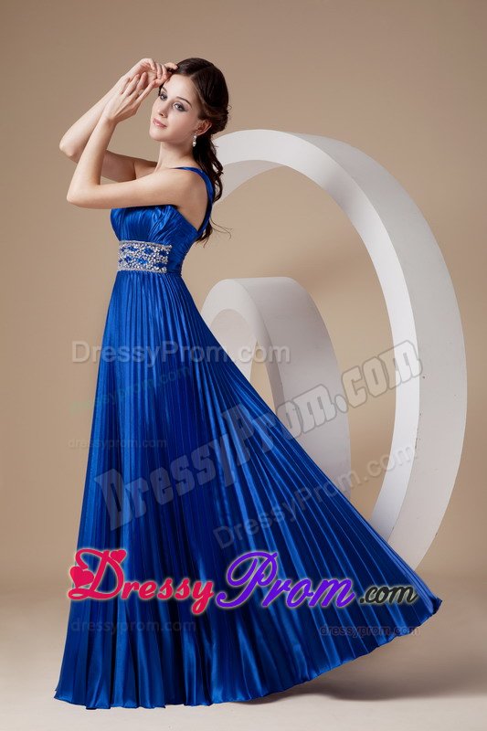 This royal blue gown features one shoulder strap and pleated details that is encrusted with crystals and embroidery along the waist. The full skirt features lovely pleated details. A bit retro and a lot gorgeous! You will look like a queen in the pretty dress.